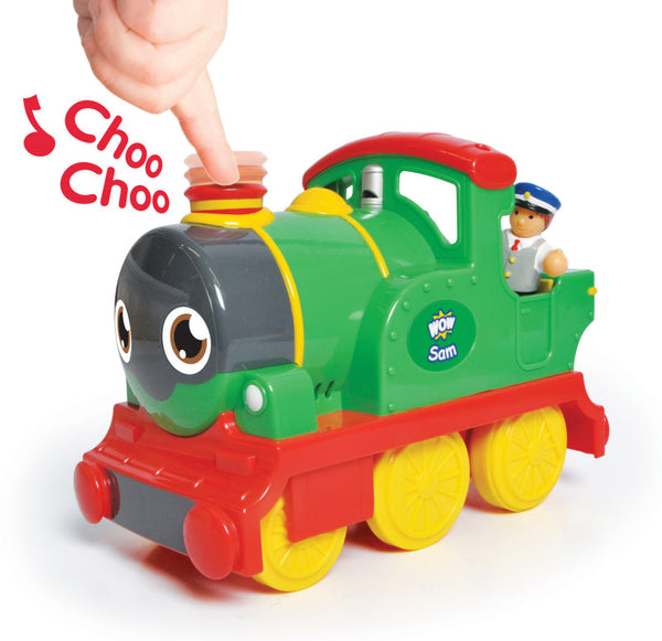 Press Sam's chimney to hear his realistic train whistle and give Sam a push to power his motorised engine.