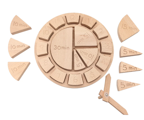 Learning Clock: Main board measures 23.5 cm in diameter and the fractions with radius 6.2 cm and fit in the inner ring of the clock board. All parts made by durable beech wood.